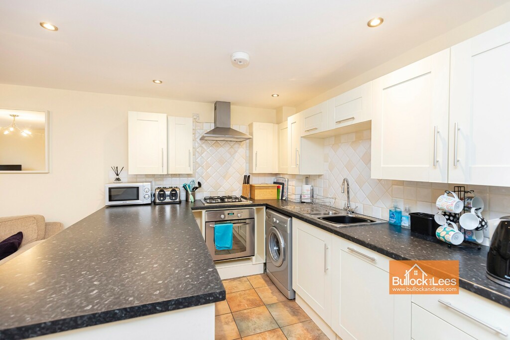Large window to the front aspect, the room is split in two with the kitchen on the right as you enter, with the main living area beyond by the windows. This area has carpeted flooring with ample space for both sofa and dining suites.