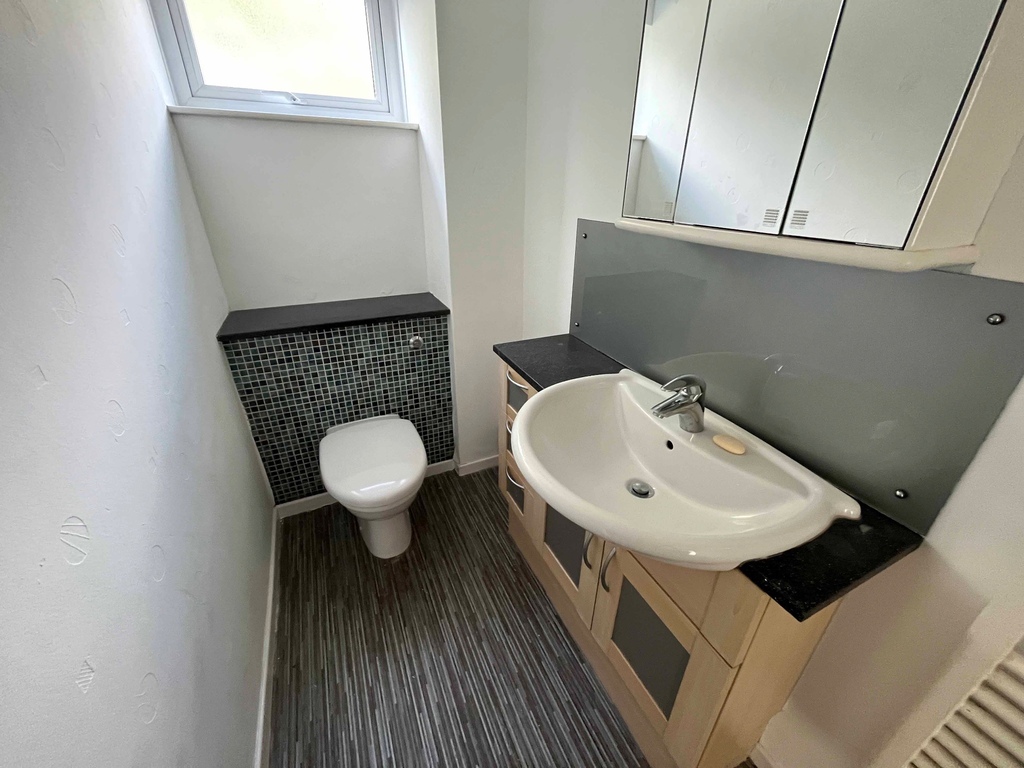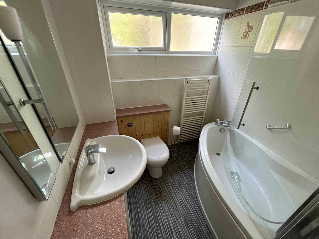 The bathroom has a window to the front as well and does the additional cloakroom to the side. There is a bath with shower over, WC and basin.