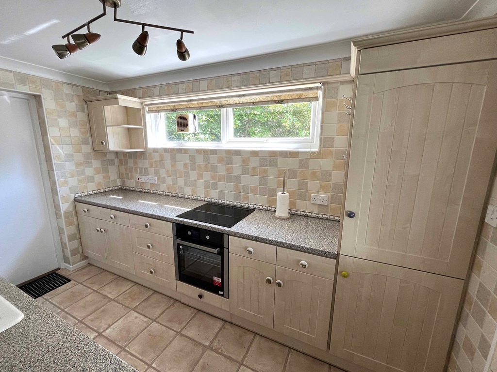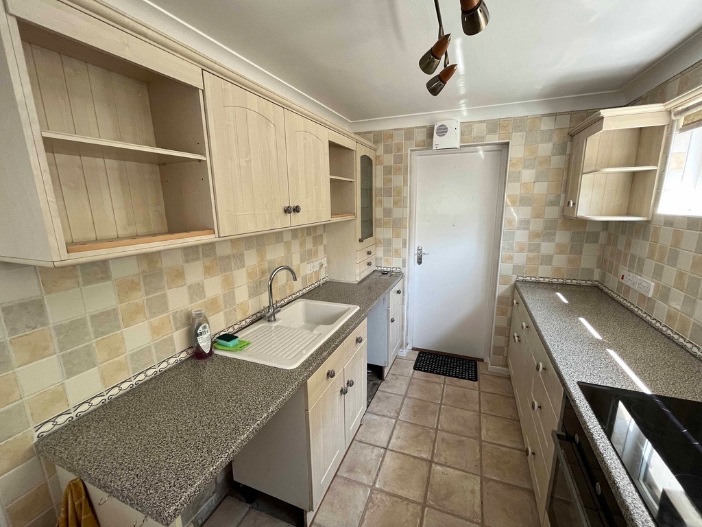 The kitchen has a high level window to the side with a full range of base and wall units. There is a sink to the left and to the right is a new electric hob with new oven under and to the right, a new integrated fridge/freezer. A door at the end leads to an outside stairway where there is and addititonal storage cupboard.