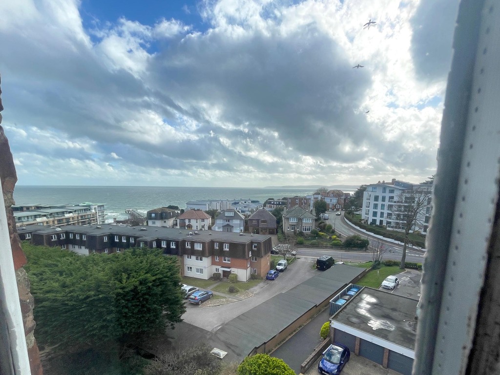 The living room has windows to the front and a round dining area to the left whose windows have views out over Boscombe Spa to the sea beyond.