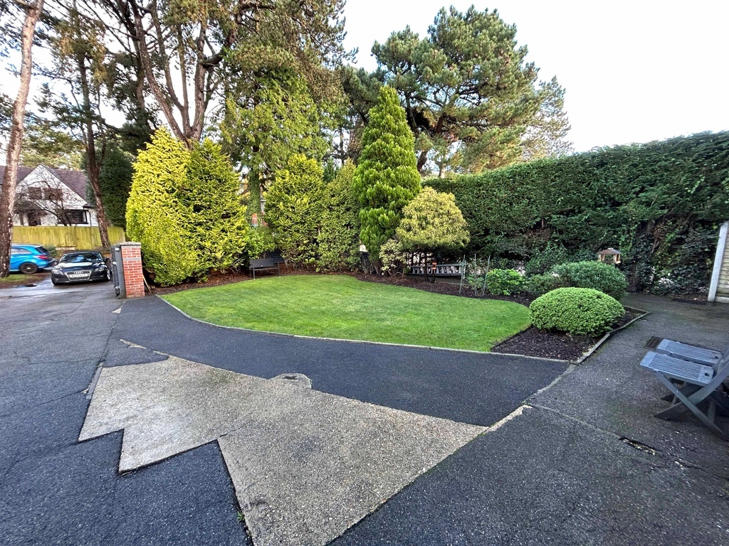 A gated driveway from Queens Park Avenue leads up to the off-road parking for several vehicles. There is a lawn to the left with tall hedging giving privacy.