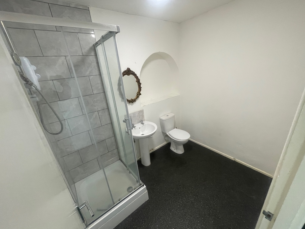 Shower cubicle with electric shower, pedestal wash hand basin and box cistern w/c. Tiled splash backs, vinyl flooring and extractor fan.