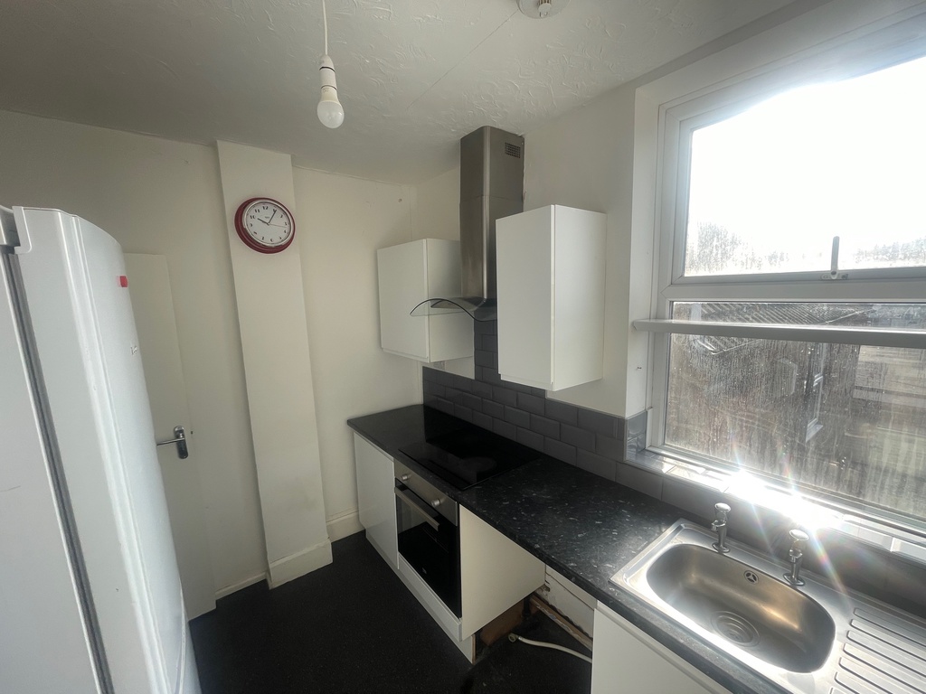 Window to rear aspect, radiator, newly fitted kitchen comprising, Single bowl single drainer stainless steel sink set into rolled edge laminate working surfaces with drawer and storage units under. Tiled splash backs lead to wall mounted eye level units, there is space and plumbing for washing machine, space for tall fridge/freezer, laminate flooring.