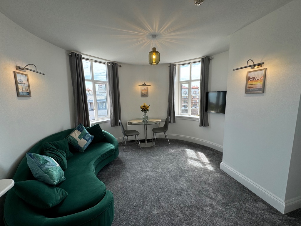 The living room has windows to the front and a round dining area to the left whose windows have views out over Boscombe Spa to the sea beyond.