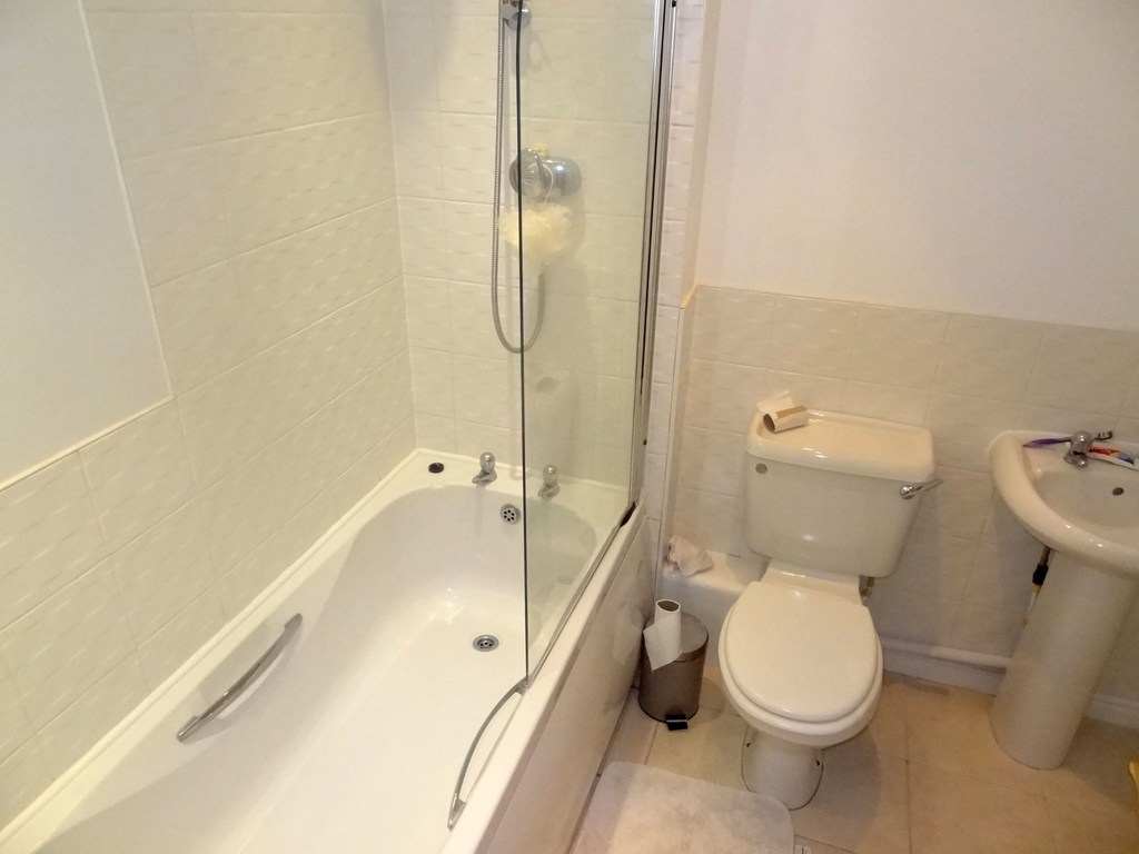 White suite comprising bath, wall shower, close coupled WC, pedestal wash hand basin, radiator, part tiled walls, tiled floor and extractor fan.