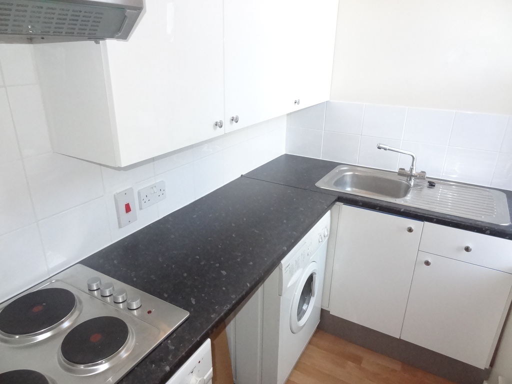 Re-fitted with a range of modern white units comprising selection of wall and base units with tiled splashbacks in between. Sink, hob and oven and also with under worktop fridge and washing machine.