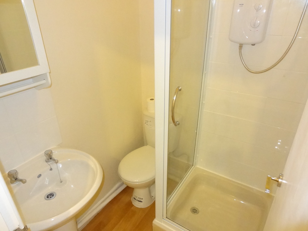 Fitted with a modern white three piece suite comprising corner shower cubicle with adjacent WC and wash basin.