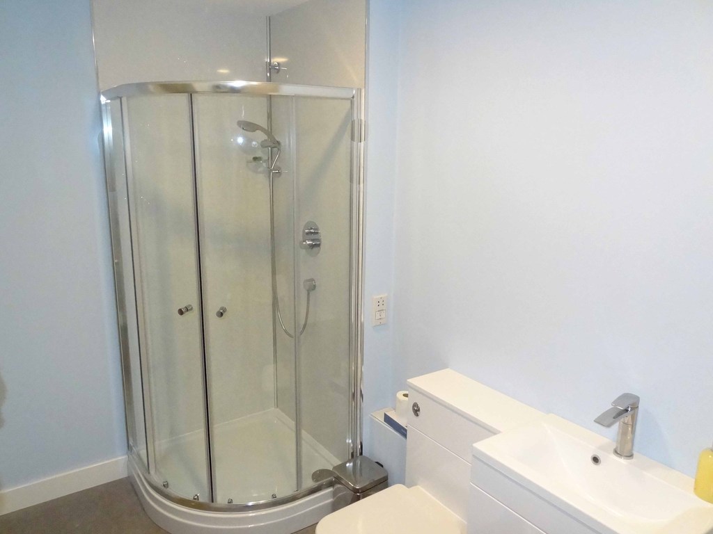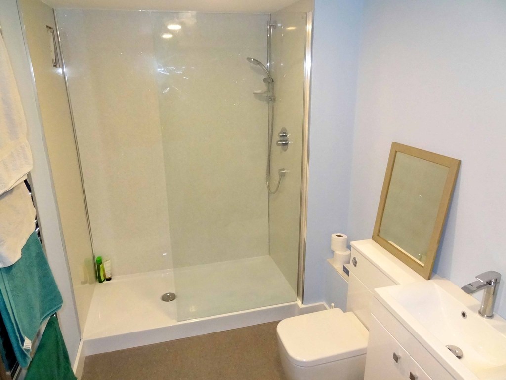 Fitted with a room width shower cubicle with glazed screen and wall mounted shower. Matching WC and basin. Radiator.