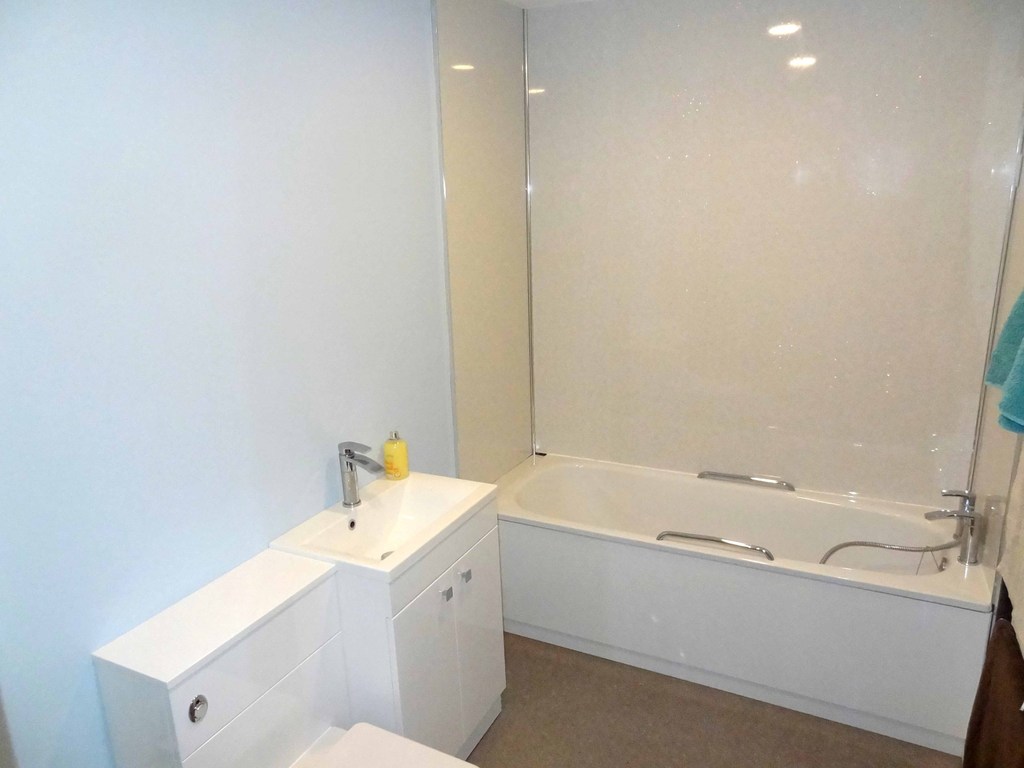 Fitted with a bath with tiled surround and shower fitment. Although there is also a separate corner curved glass shower cubicle to one side as well. Matching WC and basin. Radiator.