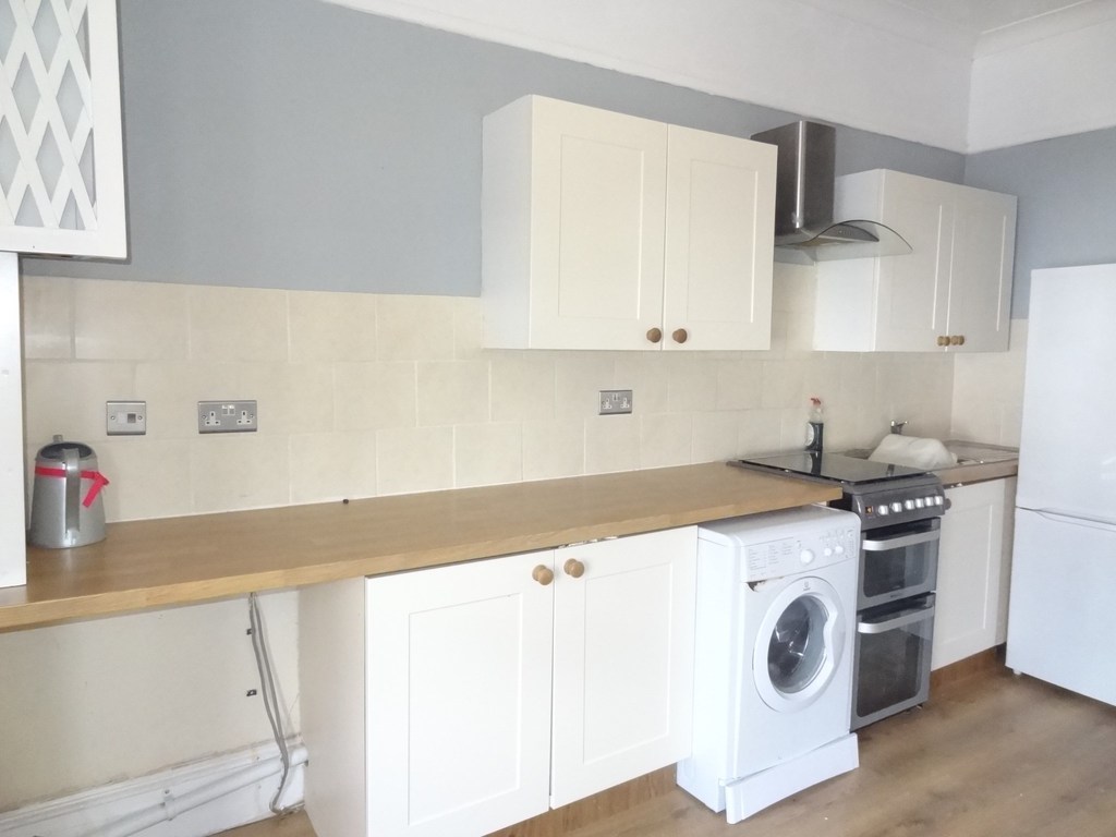 UPVC bay window to front aspect, to the right hand side is the kitchen area which provides, sink, cooker, selection of cupboards, space and plumbing for washing machine and fridge/freezer.