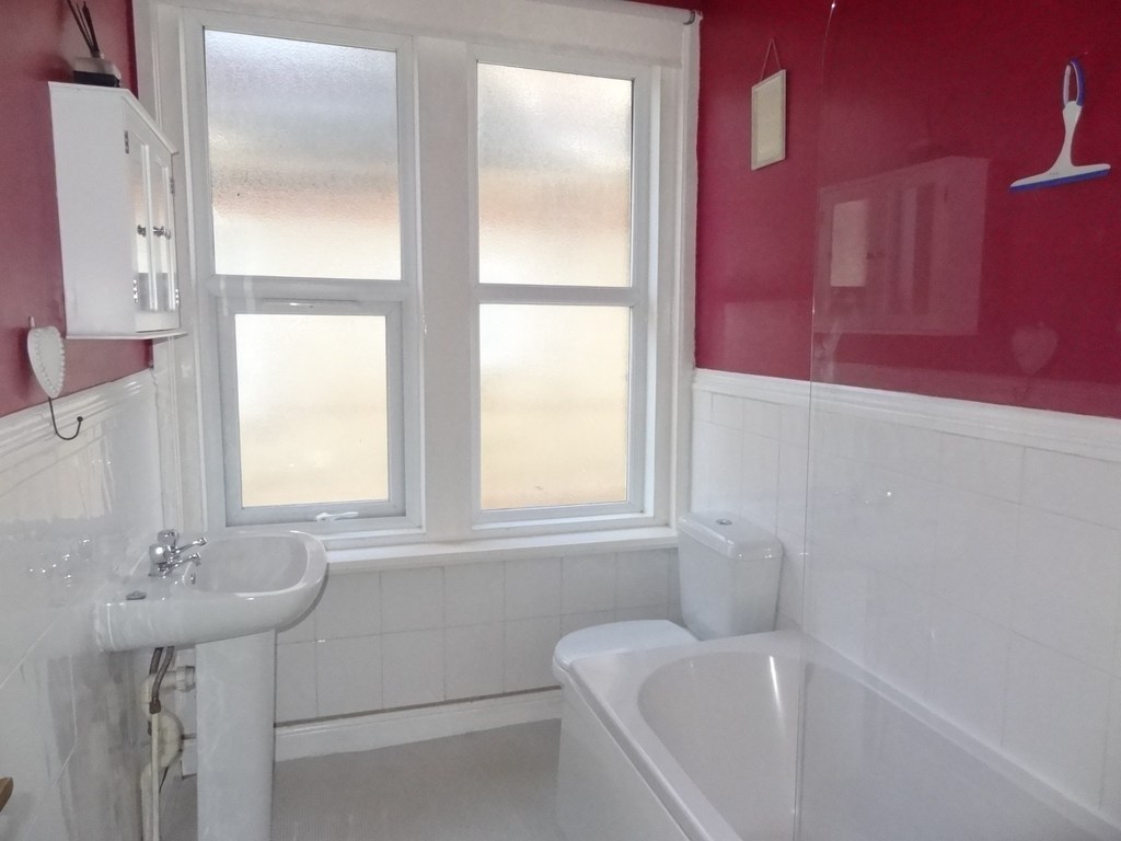 UPVC obscured window to side aspect, fitted with a three piece white suite comprising, bath with shower over, pedestal wash hand basin and matching closed coupled w/c, radiator.