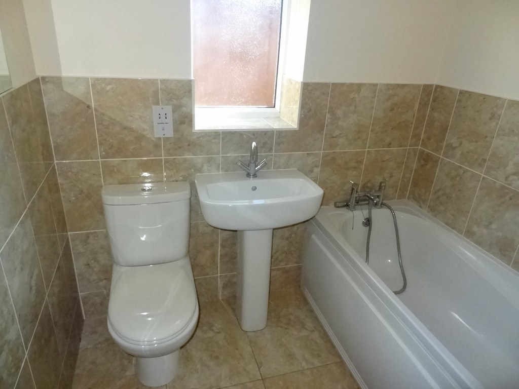 Obscured glazed window to side aspect, fitted with a modern white three piece suite comprising bath with mixer tap and shower attachment, pedestal wash hand basin and matching w/c, part tiled walls and floor.