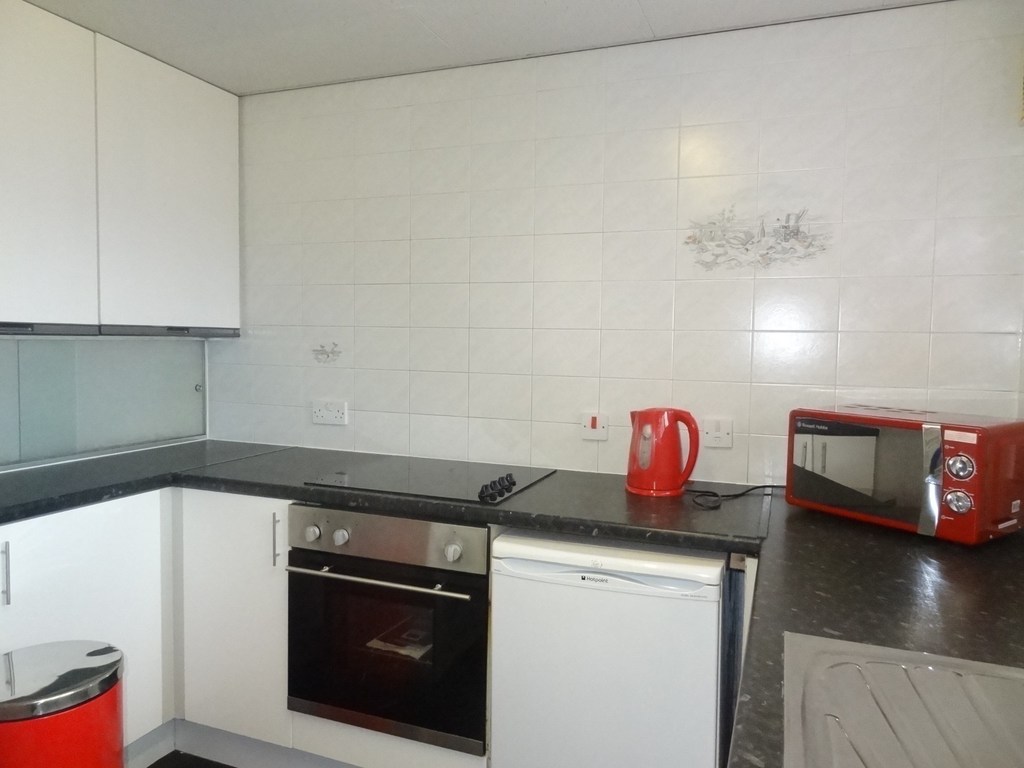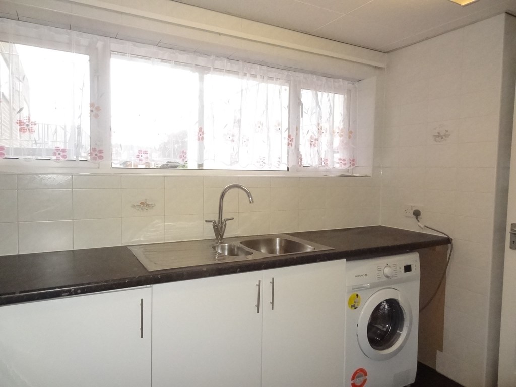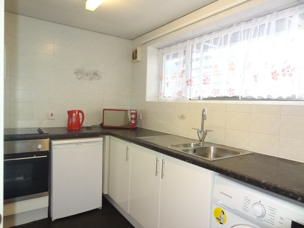 Window to front aspect, fitted with a range of white modern units and single bowl single drainer sink. White goods include oven and hob, washing maching and fridge.
