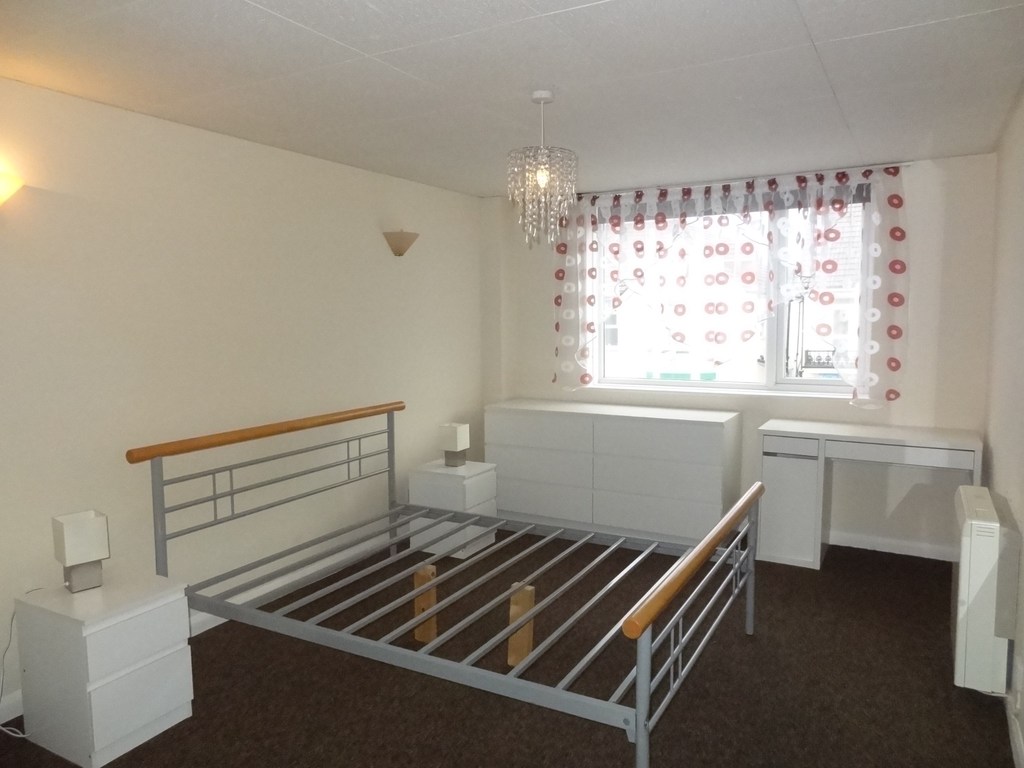Windows to side aspect, fitted triple wardrobe with shelving and hanging space, double bed frame, chest of draws and bed side cabinets.