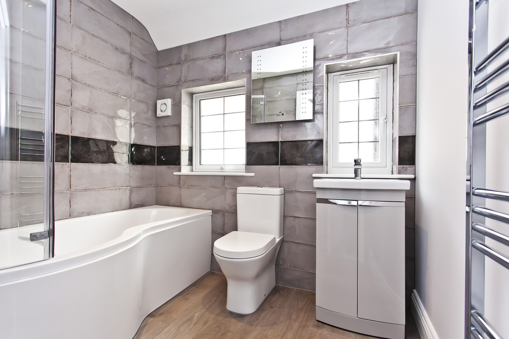 Window to side aspect, fully tiled walls and fitted with a three pieces suite comprising ‘P-Shaped’ shower bath with wall mounted mixer tap and shower attachment with hinged glass screen to the side, closed coupled w/c and vanity basin with storage cupboard under, chrome ladder style towel rail/radiator, extractor fan.