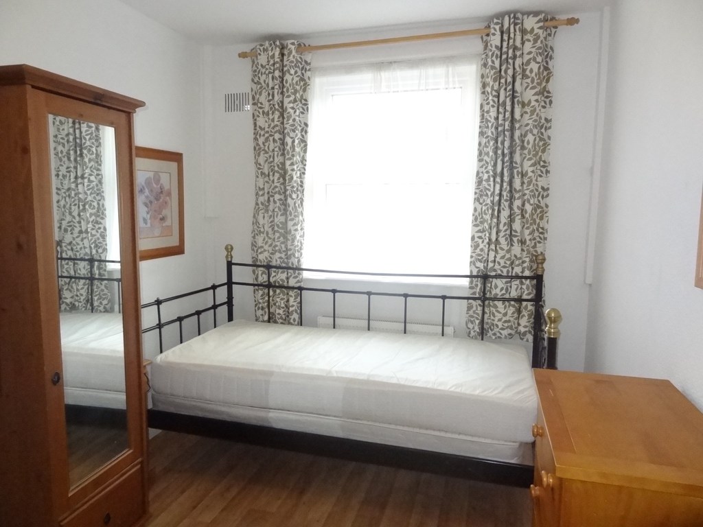Window to side aspect, radiator, shower cubicle with electric shower, furnished with a single ornate bed, wardrobe and chest of drawers.