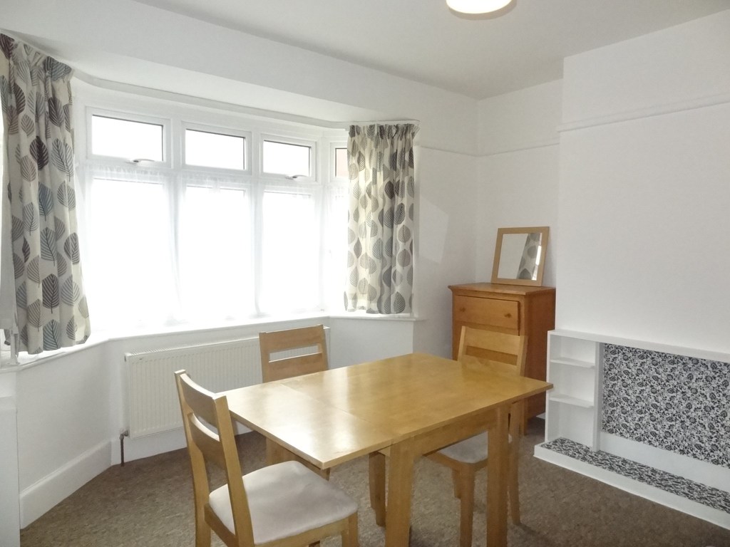 Bay window to front aspect, radiator. A bright sunny room furnished with a modern oak dining table and matching chairs, sideboard and decorative fire surround, carpet flooring.