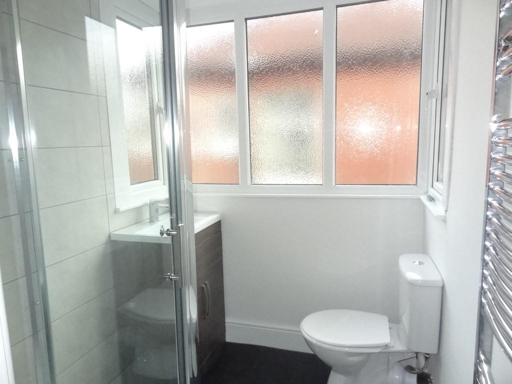 Obscured glazed window to side aspect, chrome ladder style radiator. Fitted with a modern three piece suite comprising shower cubicle fitted with an electric shower, vanity unit with wash hand basin and closed coupled w/c, vinyl flooring.