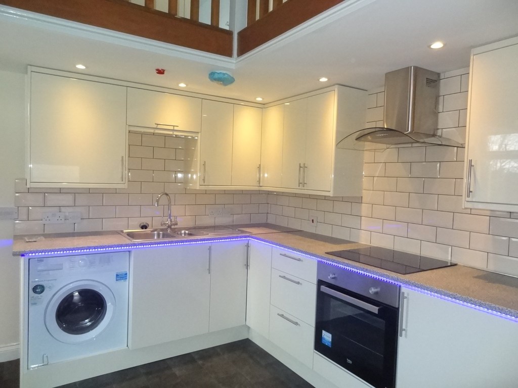 UPVC Double glazed window to side aspect. The kitchen comprises a one and a half bowl sink set into rolled edge laminate working surfaces with drawers and storage cupboards under, tiled splash backs lead to a range of eye level wall mounted units. Cooking facilities are provided by a four ring electric hob with housed electric oven under and extractor hood over, the washing machine and fridge/freezer are all integrated. Vinyl flooring.