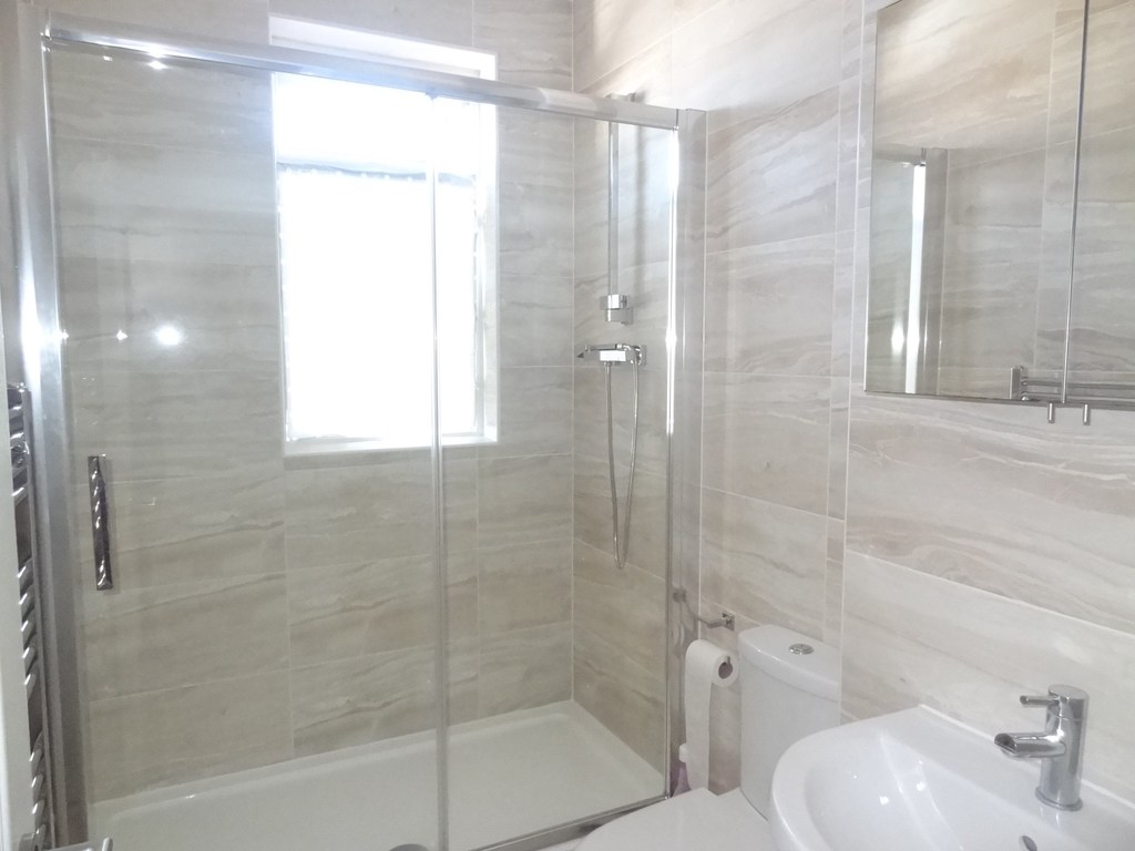 Window to side aspect, large double shower cubicle with electric shower over, wash hand basin and matching w/c.