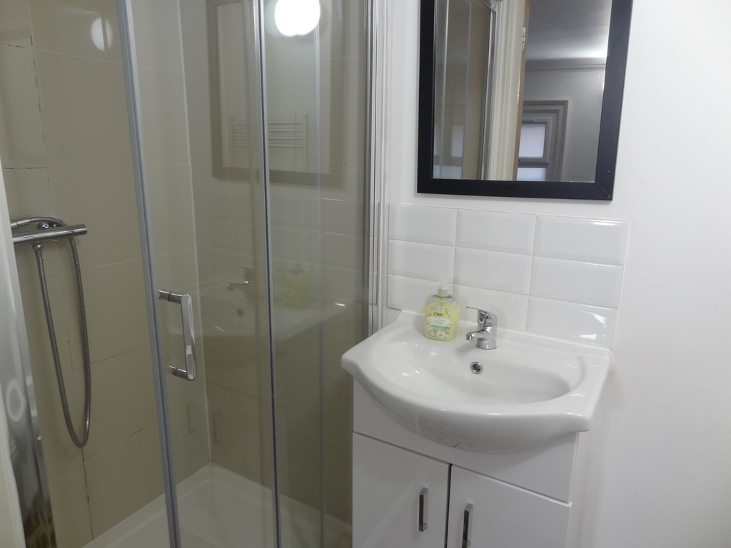 Fully tiled walls and ceilings, fitted with a modern white suite comprising bath with mixer tap and shower attachment over, vanity basin, closed coupled w/c and heated towel rail.