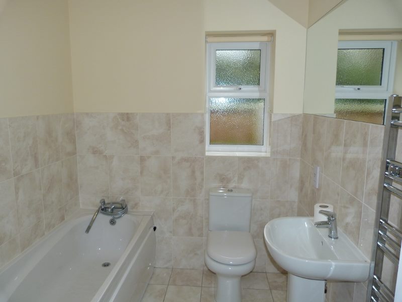 Obscured double glazed window to side aspect. Fully tiled walls and fitted with a modern white suite comprising bath, bath and WC. Tiled floors.
