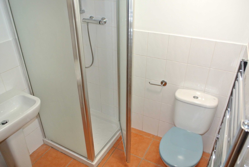 Tiled flooring and half tiled walls, with a three piece suite comprising corner glazed shower cubicle, pedestal wash hand basin and matching w/c. To one side is a good sized useful built-in storage cupboard, mini strip light and shaver point and radiator/towel rail.